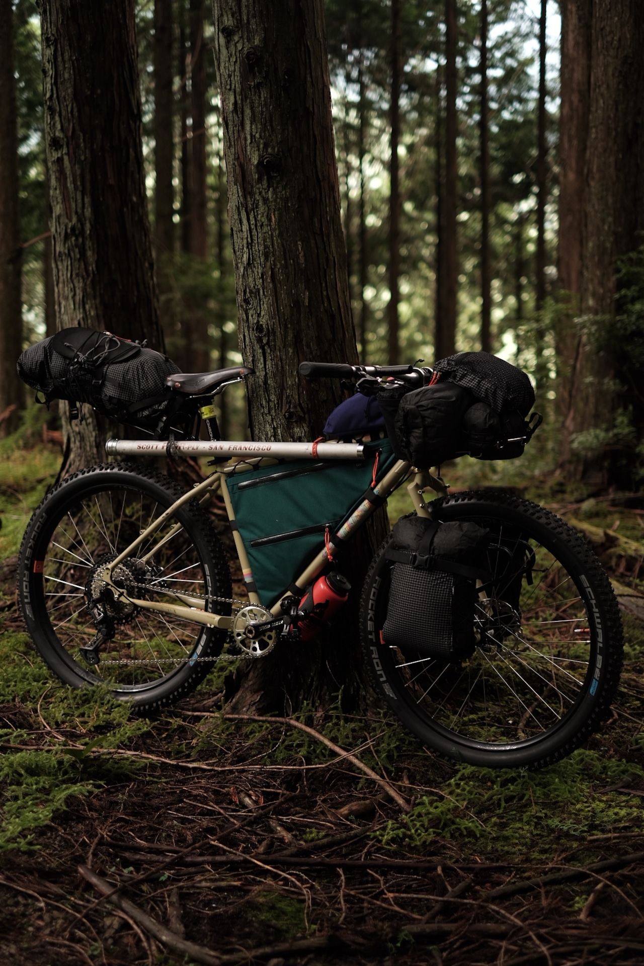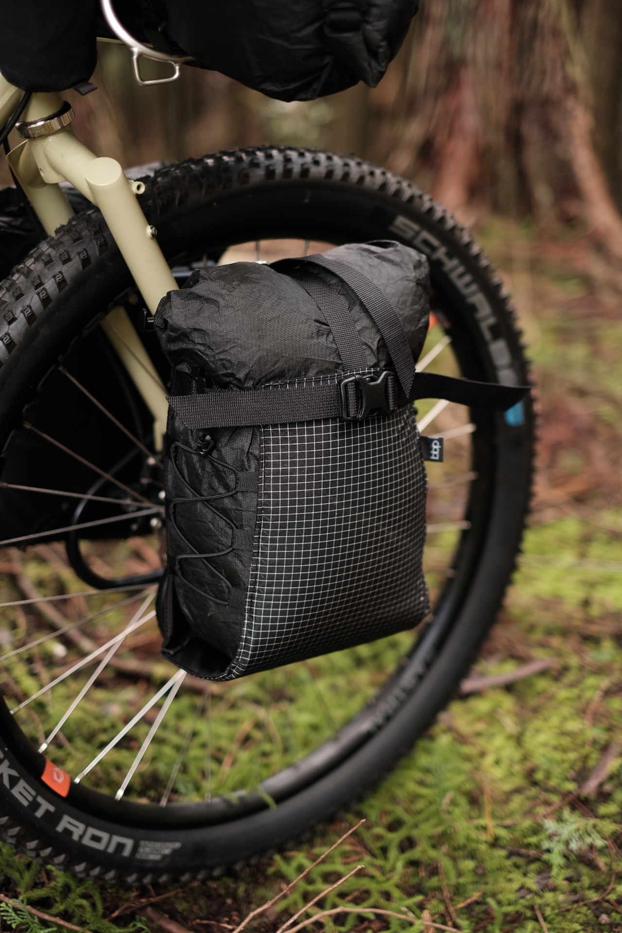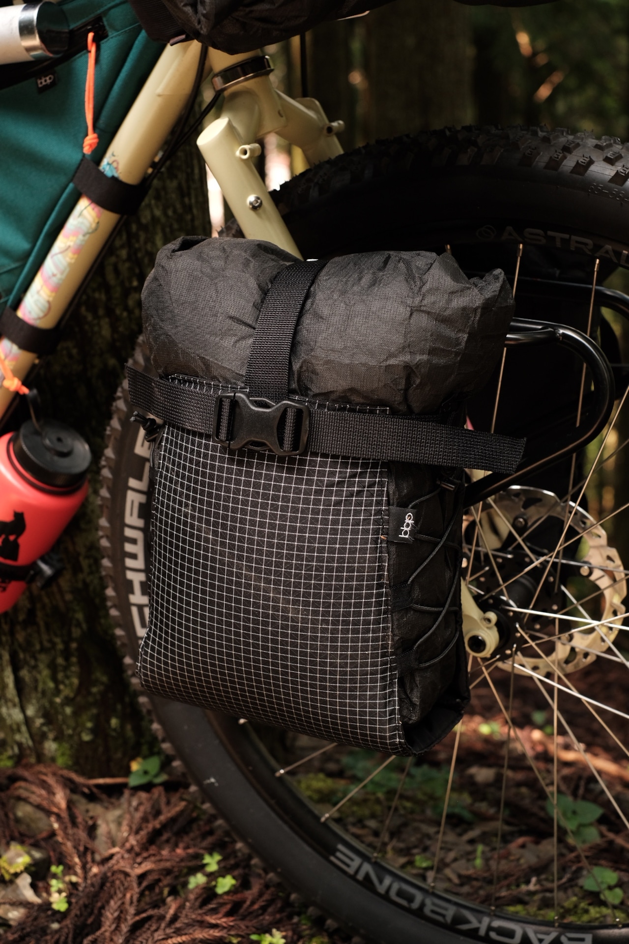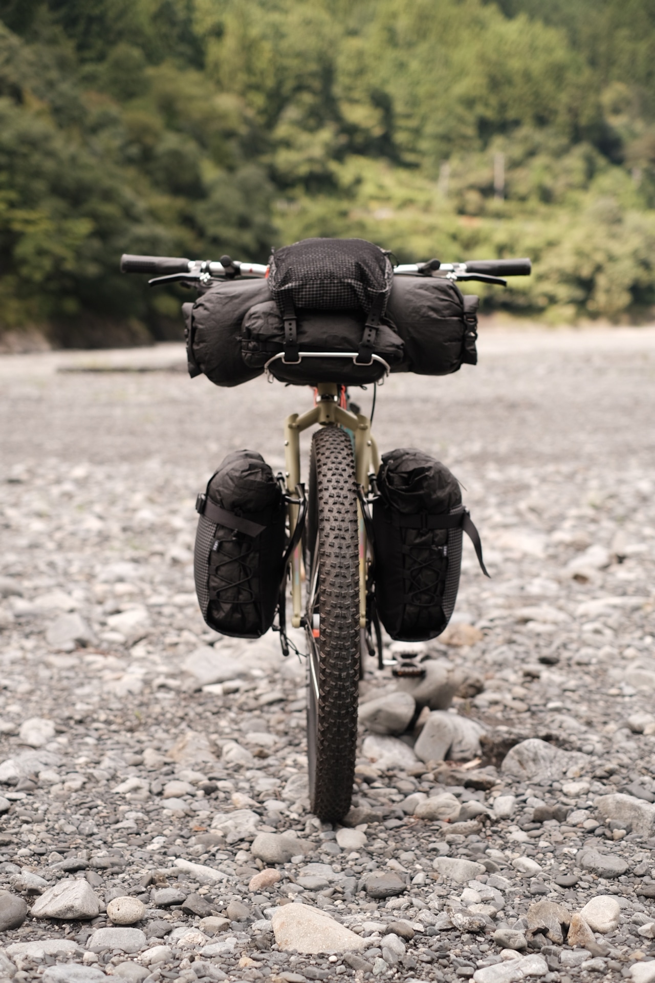 パニア部分は雨ざらしになるので、防水パックを使うことが多いでしょう。写真はbbpオリジナルのドライバッグを収納していますが、マスプロダクトではSEA TO SUMMIT 社の【ビックリバードライパック13L】などが適合します。自転車をデポしてバックパックにパッキングし直す際も、ドライバッグのみそのまま移し替えることが可能です。